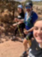 Flying Monkey Mesa was honestly a bit of a blur. I caught up to and passed and then was passed again by Everett, a 59 yr old guy from Washington who would turn 60 at midnight. We had hopscotched each other all day (and would the rest of the race) and he’d been ahead of me till he had bad stomach issues. This tough dude couldn’t keep anything down mile after mile, but he kept trying and when he’d puke he’d just soldier onward. He inspired me and also hiked way faster than me! Bernie caught back up with me having had serious thoughts of dropping at Smith Mesa Aid, but was told it was “mostly downhill” to BMX Aid. Yeah… not so much. Plenty of up and down till we finally came to the “rappelling” section dropping into BMX. Again we would be descending around 1700 feet in about a mile, but this section was hairy. The trail clings to the side of the cliff and in parts has boulders to clamber over and even a section of rope to climb down a rock face. Parts of the trail were so narrow you wouldn’t put two feet next to each other, and the drop-off to the right was terrifying. I had been fried navigating the Flying Monkey Mesa, but now I was ENERGIZED and laughing! I was suddenly having FUN again! As we finally navigated the last narrow rolling trails off the cliffside and into the valley I saw a familiar figure on the top of a rise in the trail… my own Audrey had run out almost a mile to greet me as she’d become worried that the light was fading and she knew I had no headlight. I nearly cried seeing her, and we ran into BMX Aid together, where my crew awaited at the RV with fresh socks/shoes/shirt and supplies.